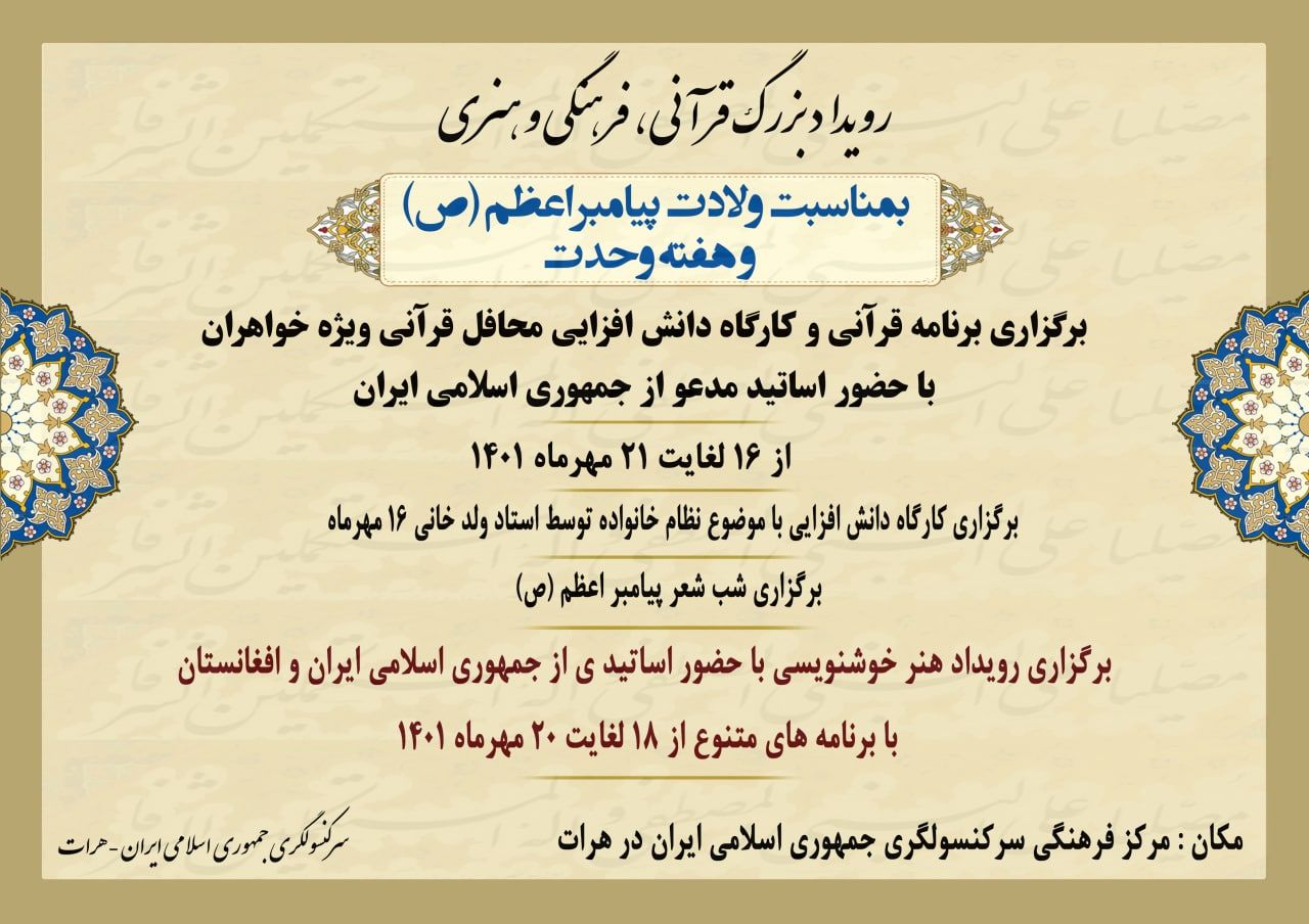 به مناسبت ولادت پیامبر اعظم (ص) و هفته وحدت سر کنسولگری جمهوری اسلامی ایران در مرکز فرهنگی این نمایندگی برنامههای زیر را برگزار مینماید .
